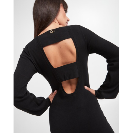 Robe Twinset, encolure bateau, découpe profonde au dos avec larges bretelles, volant délicat en bas, manches longues bouffantes.