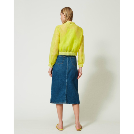 Jupe Twinset, mi-longue en jean avec léger délavage stone washed, 5 poches, taille regular, coupe droite, passants à la taille, grande fente sur le devant, ceinture avec boucle siglée Oval T en métal. Info Taille : 38 = 34 / 40 = 36 / 42 = 38 / 44 = 40 / 46 = 42.