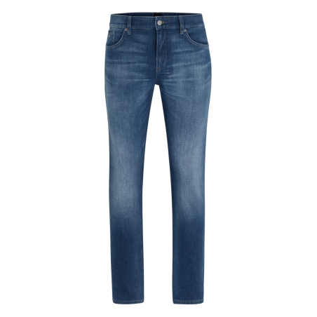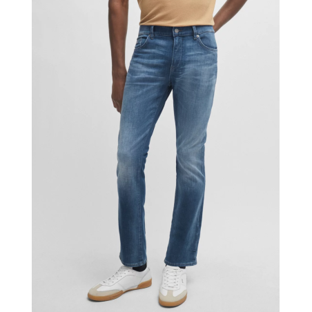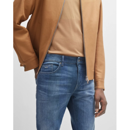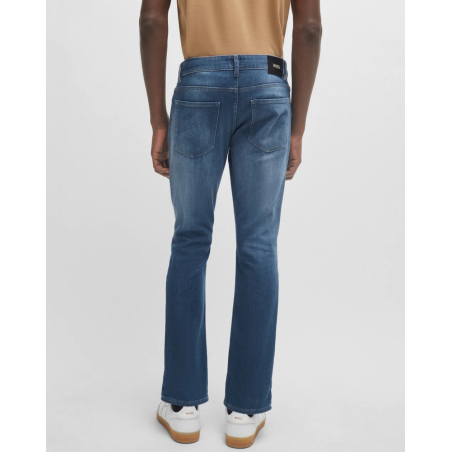 Jeans Boss, confectionné en Italie en denim stretch bleu, taille standard, fermeture zippée.