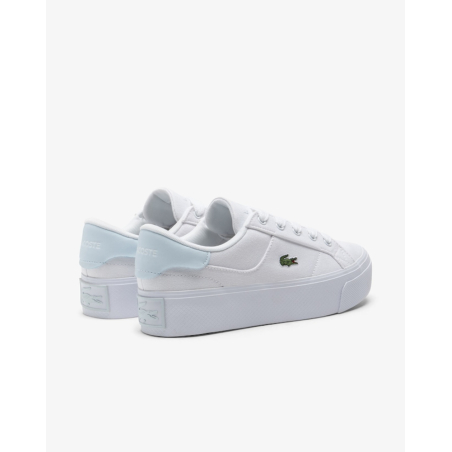 Sneakers Lacoste, tige en toile, lacets généreux, doublure en textile, semelle extérieure en caoutchouc, crocodile brodé sur le quartier.