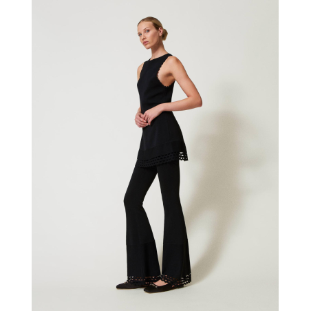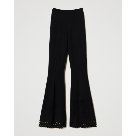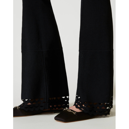 Pantalon Twinset, pantalon en crêpe de viscose stretch point jersey avec motif géométrique ajouré dans le bas, taille élastique, étiquette siglée Oval T à l’arrière, pli marqué et coupe évasée.