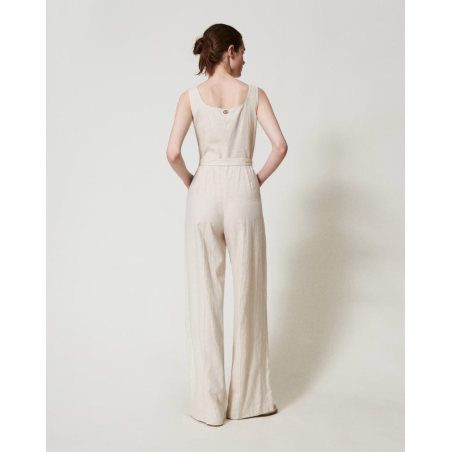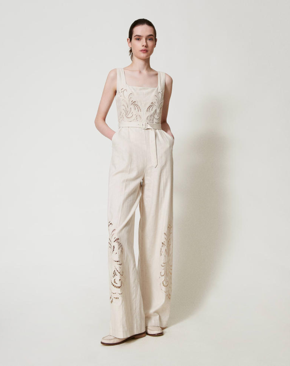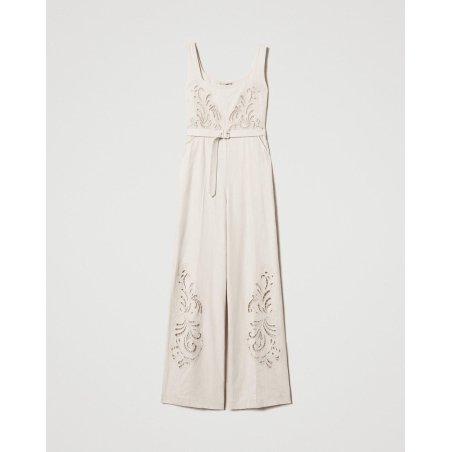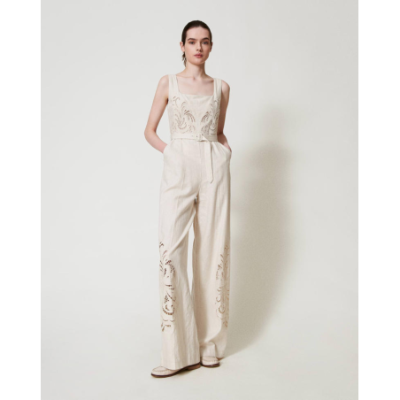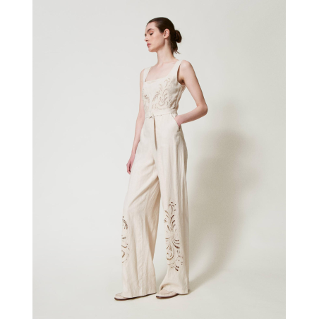 Combinaison Twinset, en tissu navette avec armure toile en lin et viscose au toucher fluide, broderie ajourée placée en fil assorti, motif d’inspiration paisley, profonde encolure, corsage près du corps, taille marquée, pantalon palazzo, poches italiennes, fermeture éclair invisible sur le côté, pli marqué, doublure en mousseline de coton, coupe droite, ceinture amovible assortie dotée d’une boucle revêtue.