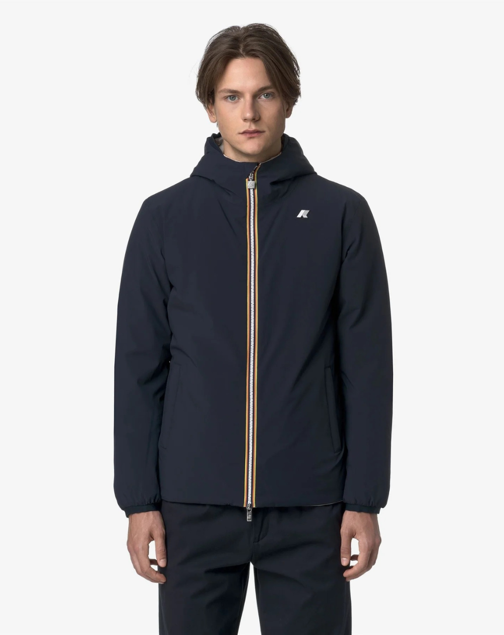Polyester extensible imperméable, déperlant, coupe-vent et respirant, polyester coupe-vent et déperlant, rembourrage synthétique, chaleur moyenne, réversible, coutures thermocollées, capuche réglable avec cordons élastiques, fermeture éclair, bords élastiques, 2 poches zippées, 2 poches à bouton-pression, coupe slim, logo en silicone blanc.