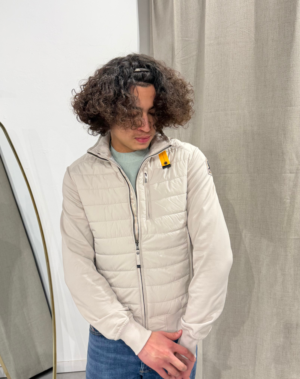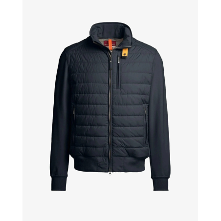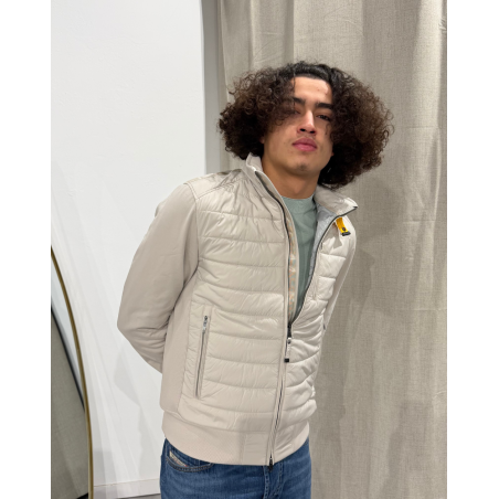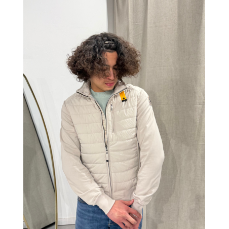 Tissu principal : taffetas en polyester recyclé avec finition mate Deuxième tissu : molleton en coton stretch Doublure : taffetas en nylon recyclé 20 deniers avec finition semi-brillante Rembourrage : ouate de polyester 120 g Fermeture frontale à glissière double sens Trois poches zippées à l'avant et deux poches intérieures à velcro Bas, poignets et panneaux latéraux côtelés Patch Parajumpers sur la manche Iconique bande jaune à la fermeture du col