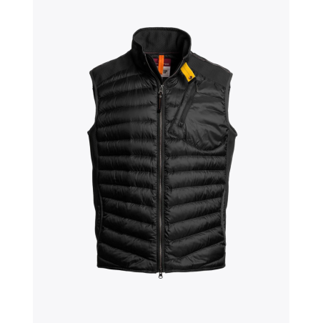 Tissu principal : taffetas en nylon recyclé 20 deniers avec finition semi-brillante Second tissu : nid d'abeilles associé à un jersey intérieur doux, tous deux en polyester stretch Doublure : taffetas en nylon recyclé 20 deniers avec finition semi-brillante Garnissage : 100 % duvet de canard Fermeture avant par zip double sens Trois poches avant, une avec fermeture éclair et deux poches intérieures avec velcro Emmanchures, poches et bas bordés de lycra Patch Parajumpers au centre du col arrière Bande jaune iconique détachable à la fermeture du col