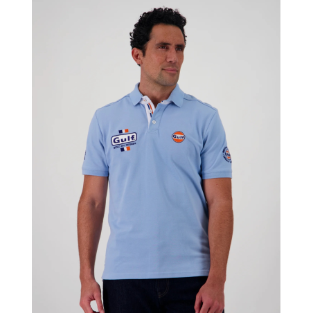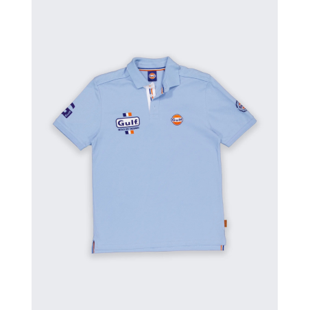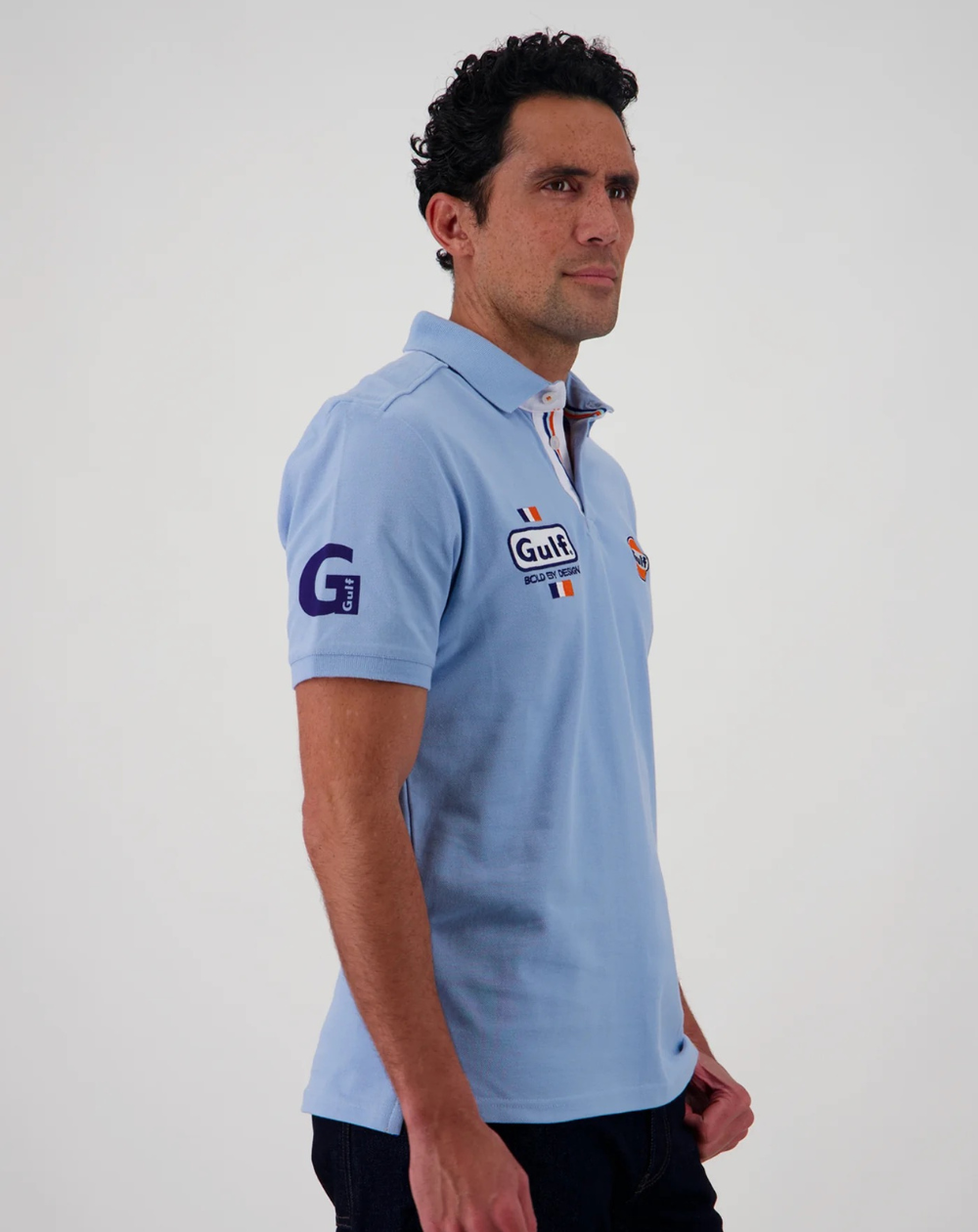 Polo en piqué de coton 220 g, col avec pied de col contrasté, épaules renforcées avec surpiqûres, broderies devant et manche gauche, sérigraphie sur manche droite.