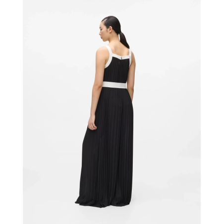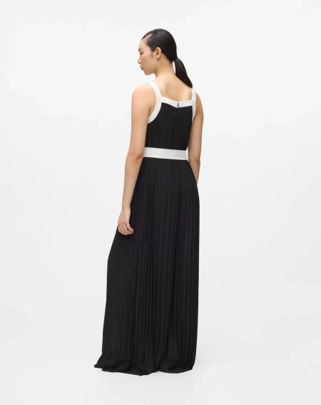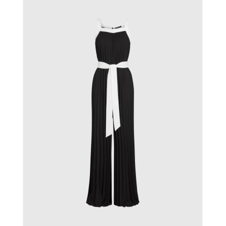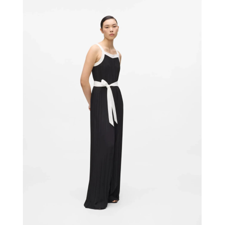 Silhouette sans manches avec une construction aux plis sophistiqués, fermeture zippée dissimulée dans le dos, pantalon fluide à jambes larges pour une allure chic, ceinture à nouer contrastante avec broderie Signature.